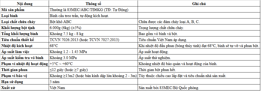 Thông Số Kỹ Thuật Của Bình Cầu Chữa Cháy Tự Động 83MEC - BQP Bột ABC 6Kg