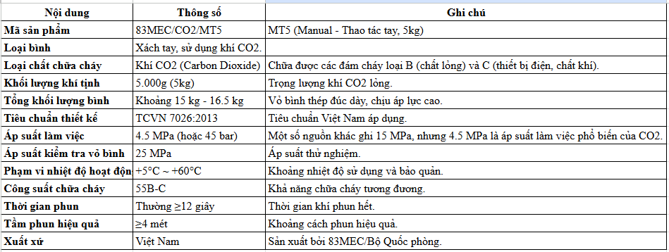 Thông Số Kỹ Thuật Của Bình Chữa Cháy 83MEC - BQP Khí CO2 MT5 5Kg