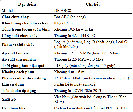 Thông Số Kỹ Thuật Của Bình Chữa Cháy Bột ABC 8Kg Defire