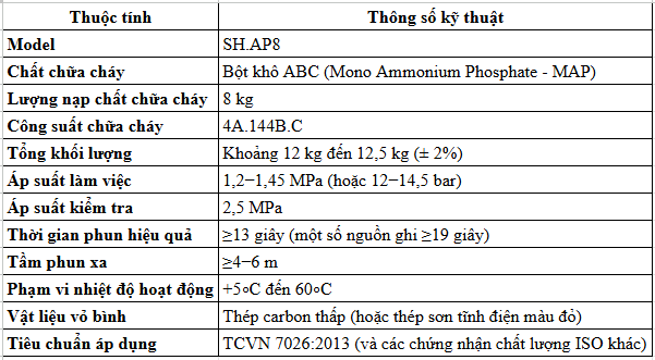 Thông Số Kỹ Thuật Của Bình Chữa Cháy Bột ABC Sông Hồng 8Kg SH.AP8