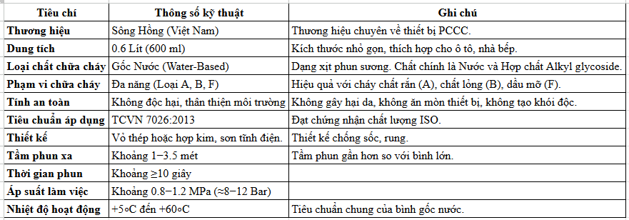 Thông Số Kỹ Thuật Của Bình Chữa Cháy Pin Xe Điện Gốc Nước Sông Hồng 600ML SH.WB0,6