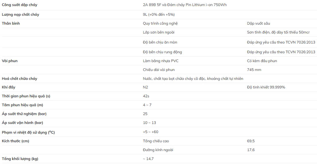 - An Toàn Khi Sử Dụng: Các tính năng an toàn như van xả tự động và chất chữa cháy không độc hại đảm bảo rằng người dùng có thể yên tâm khi sử dụng sản phẩm.