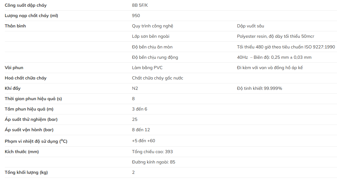 Thông Số Kỹ Thuật Của Bình Cứu Hỏa Bọt Foam 1L Dành Cho Bếp VF1 Vinafoam