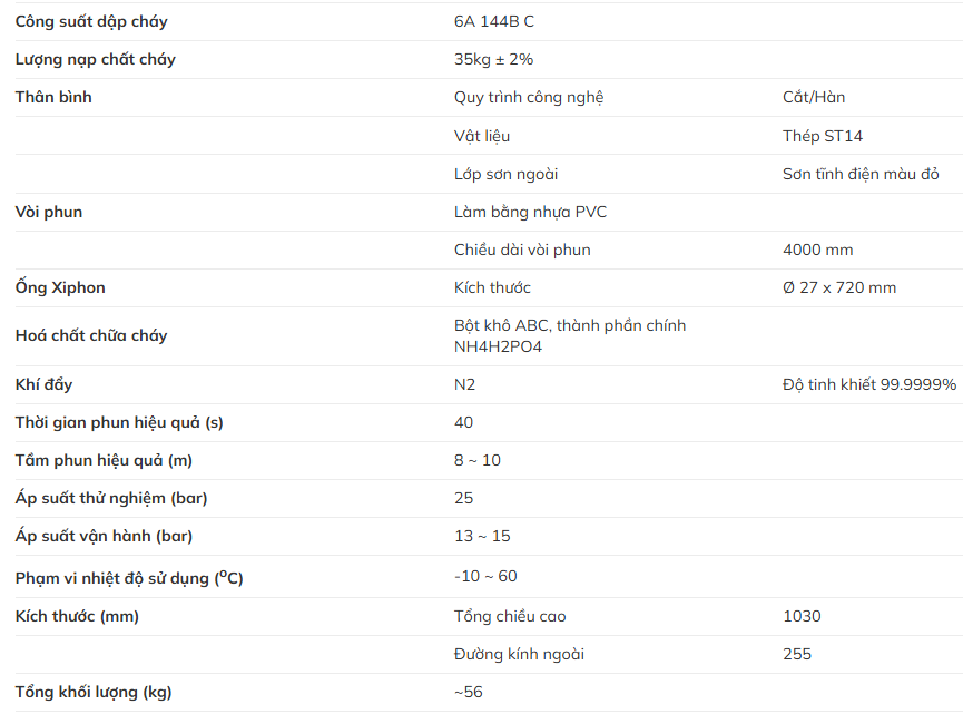 Thông Số Kỹ Thuật Của Bình Cứu Hỏa Xe Đẩy Bột ABC 35Kg Vinafoam