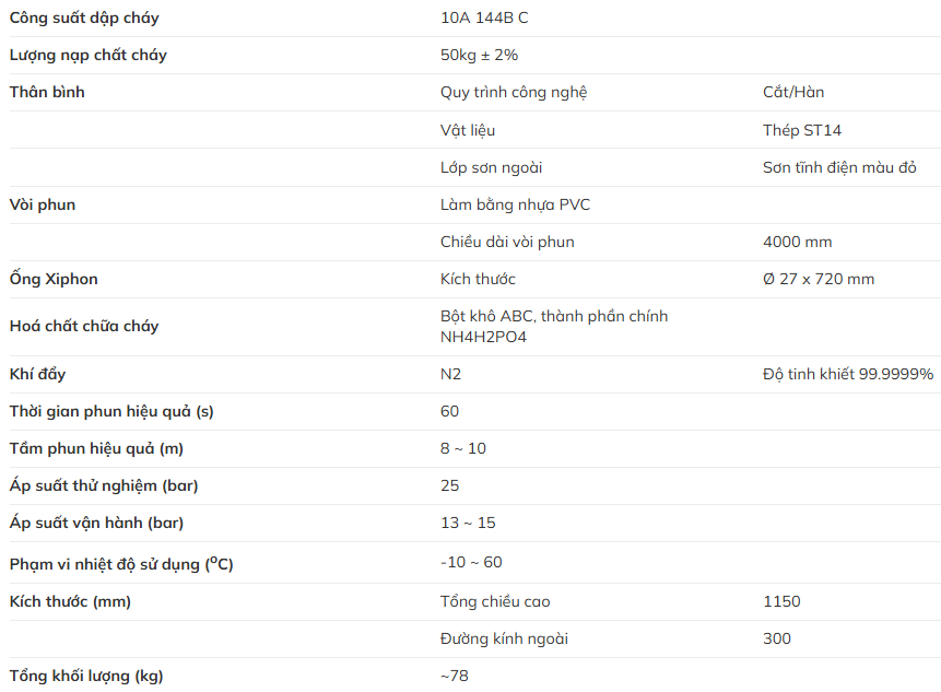Thông Số Kỹ Thuật Của Bình Cứu Hỏa Xe Đẩy Bột ABC 50Kg Vinafoam