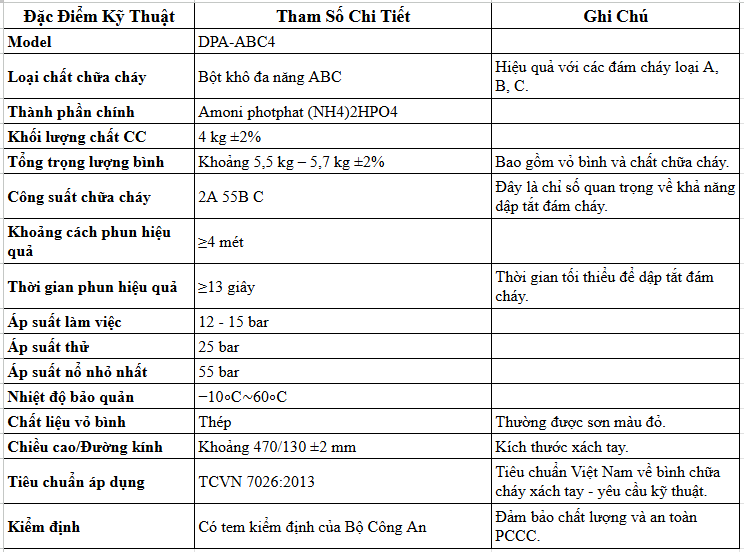 Thông Số Kỹ Thuật Của Bình Chữa Cháy Bột ABC 4Kg Dolphin