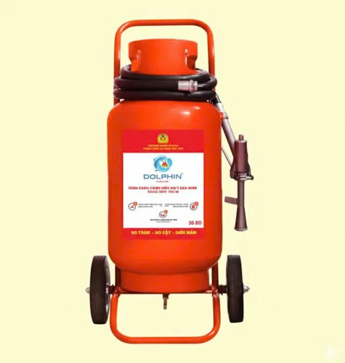 - Bình chữa cháy xe đẩy ABC 35kg Dolphin rất dễ sử dụng, chỉ cần kéo xe đến vị trí cần thiết và thao tác đơn giản để phun bột chữa cháy.