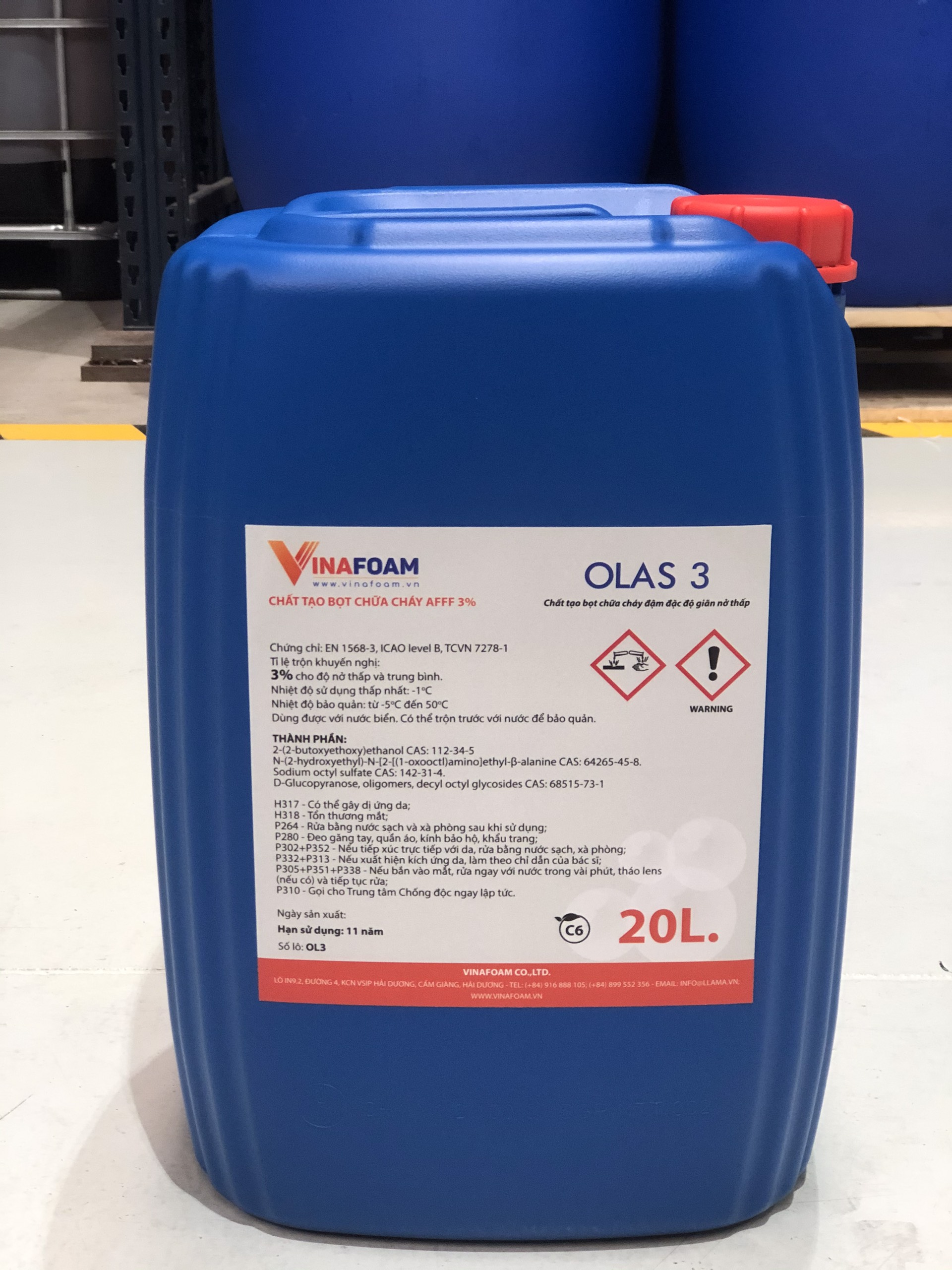 Bọt foam chữa cháylas 3 AFF3% là một sản phẩm nổi bật trong dòng sản phẩm chữa cháy của Vinafoam, được thiết kế đặc biệt để ứng phó với các đám cháy do chất lỏng dễ cháy gây ra. Dưới đây là những tính năng nổi bật của bọt foam Olas 3 AFF3%.