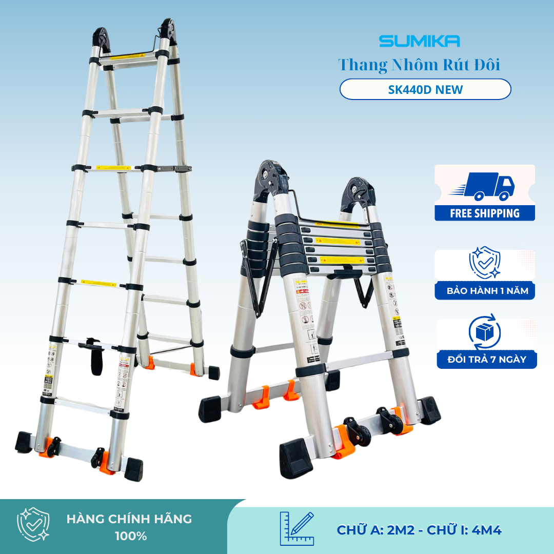 Thang Nhôm Rút Xếp Chữ A SUMIKA SK440D là một sản phẩm nổi bật trong dòng thang nhôm hiện đại, được thiết kế để đáp ứng nhu cầu sử dụng đa dạng trong gia đình và công việc. Dưới đây là những đặc điểm nổi bật của sản phẩm này: