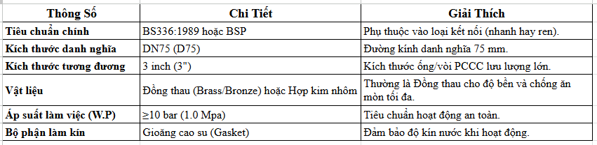 Đầu nối chữa cháy kiểu Anh BS DN75 (theo tiêu chuẩn BS336) là loại khớp nối có kích thước lớn, chuyên dùng trong các hệ thống cấp nước chữa cháy yêu cầu lưu lượng lớn, áp lực mạnh, phù hợp cho nhà xưởng, khu công nghiệp, kho bãi và lực lượng PCCC chuyên nghiệp.