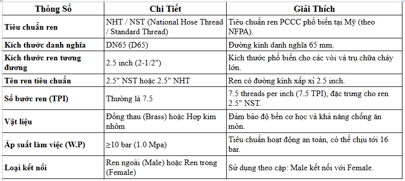 Nguyên lý hoạt động cốt lõi của đầu nối NHT DN65 dựa trên chuẩn ren xoắn National Hose Thread của Mỹ.