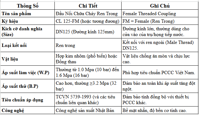 Thông Tin Chi Tiết Của Đầu Nối Chữa Cháy Ren Trong DN125 Tomoken CL 125-FM