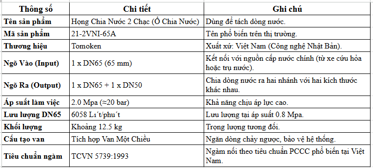 Thông Số Chi Tiết Của Họng Chia Nước 2 Chạc Chữa Cháy Tomoken 21-2VN-65A