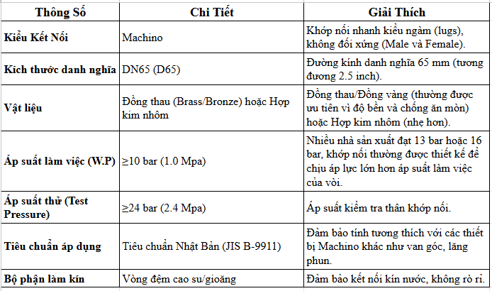 - Khớp nối DN65 được chế tạo theo tiêu chuẩn Machino Japan, đảm bảo kích thước đồng nhất.