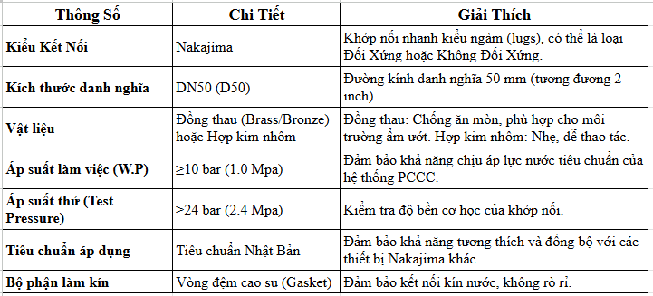 Khớp nối kiểu Nhật Bản NAKAJIMA DN50 là phụ kiện quan trọng trong hệ thống chữa cháy, được thiết kế để kết nối vòi, lăng phun, van và các thiết bị PCCC khác một cách nhanh chóng và an toàn. Với kích thước DN50, sản phẩm phù hợp cho các hệ thống cấp nước vừa và nhỏ, đáp ứng nhu cầu chữa cháy trong công trình dân dụng và công nghiệp.