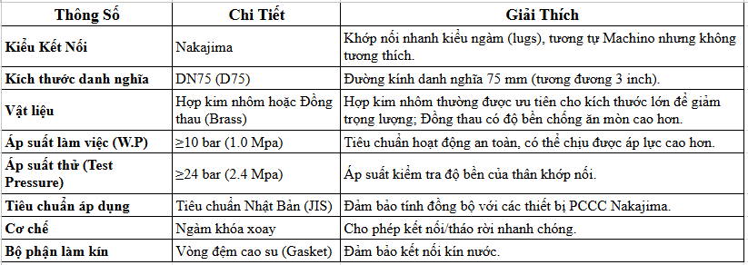 Khớp nối kiểu Nhật Bản NAKAJIMA DN75 là phụ kiện chuyên dụng trong hệ thống chữa cháy tiêu chuẩn Nhật, dùng để kết nối vòi chữa cháy, lăng phun hoặc thiết bị phân chia nước. Với kích thước DN75 – thuộc nhóm đường kính lớn, sản phẩm mang lại khả năng dẫn nước mạnh, phù hợp công trình yêu cầu lưu lượng cao.