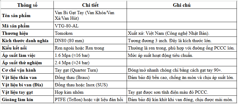 Thông Số Chi Tiết Của Van Bi Gạt Tay Van Hút DN80 Tomoken VTG-80-AL