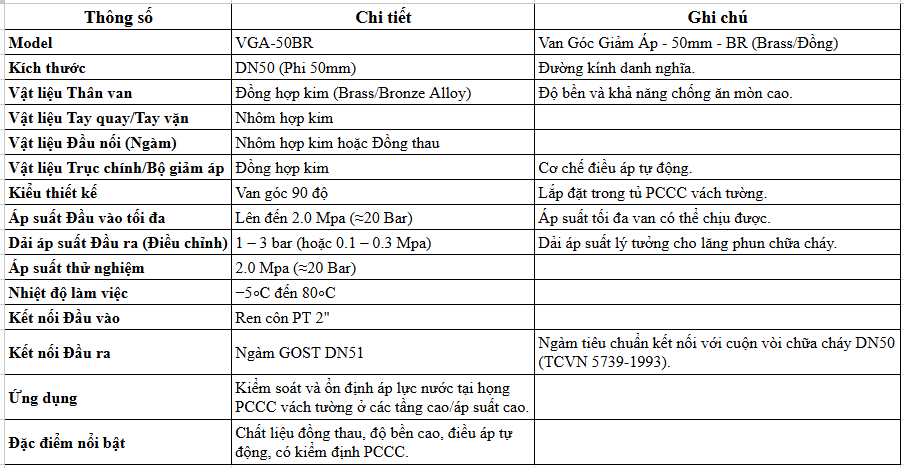 Thông Số Chi Tiết Của Van Góc Giảm Áp Đồng DN50 Tomoken VGA-50BR