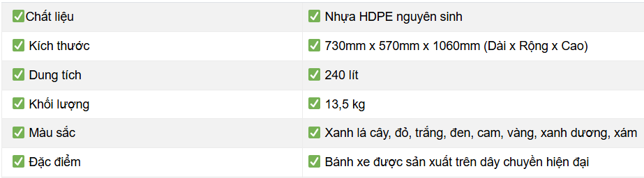 - Dung tích 240 lít: Kích thước này cho phép thùng chứa một lượng lớn rác thải, phù hợp cho các khu vực có lưu lượng người qua lại cao.