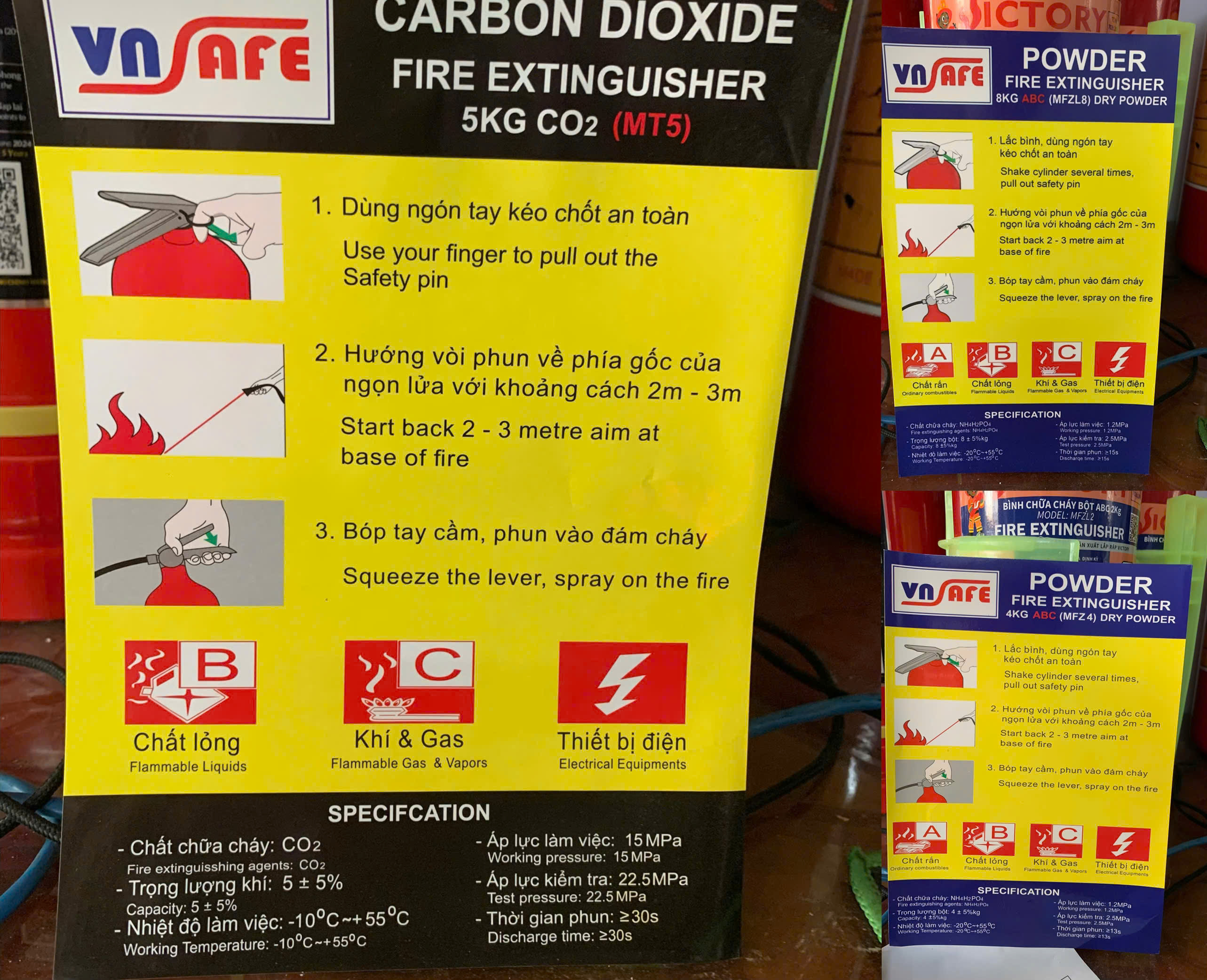 - Cảnh báo an toàn: không dùng cho thiết bị điện (nếu là bình nước), tránh hít khói bột hóa chất, đảm bảo thông gió v.v.