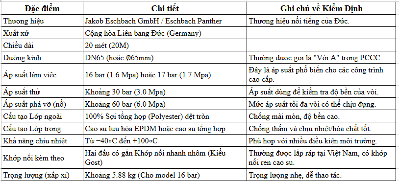 Thông Số Chi Tiết Của Vòi Chữa Cháy Đức Jakob Eschbach D65 x 20M Có Kiểm Định
